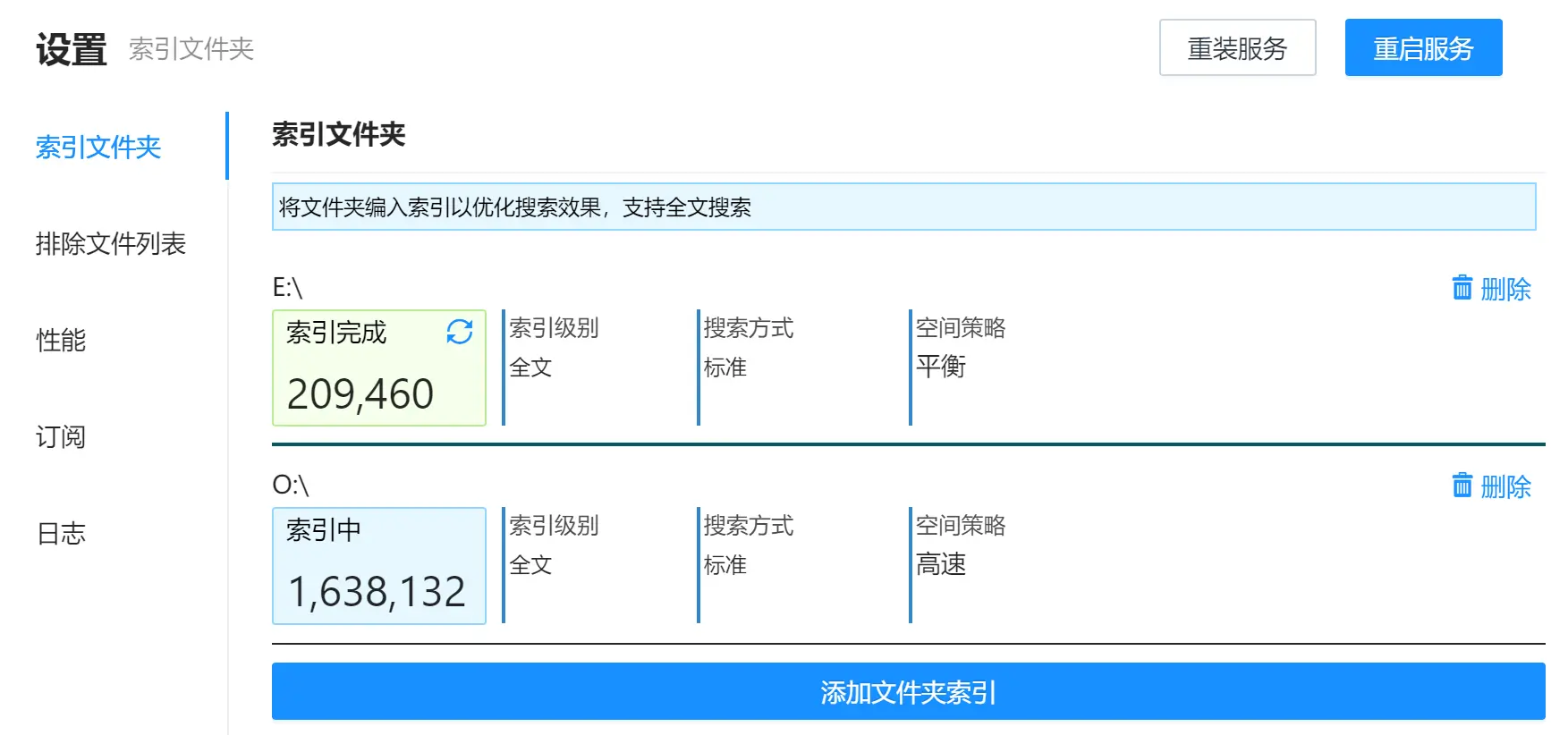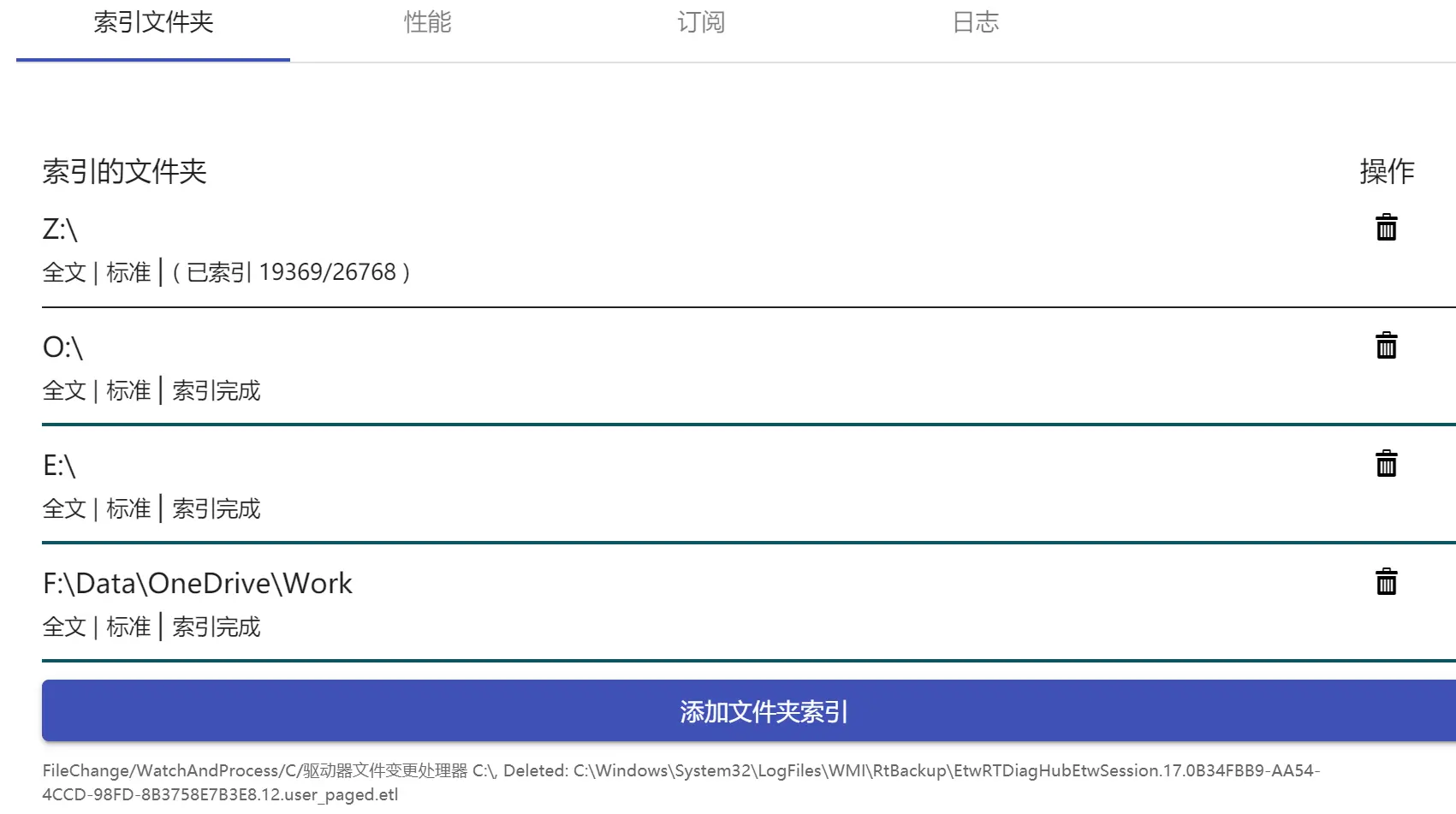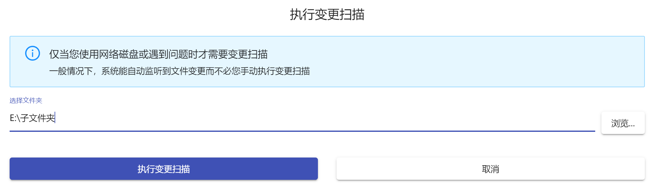 空间占用策略选项,用户可以以空间换时间方式加速网络磁盘搜索,不在乎索引大小的用户也可以使用这个选项加速搜索。【2022-02-24】新增对指定文件夹进行变更扫描的支持。一般情况下,系统能自动监听到文件变更而不必您手动执行变更扫描。但如果是网络磁盘,系统无法自动监听到修改,而且考虑到有的用户网络文件夹存储了海量数据,全部扫描一遍非常耗时,因此支持对指定文件夹进行变更扫描。