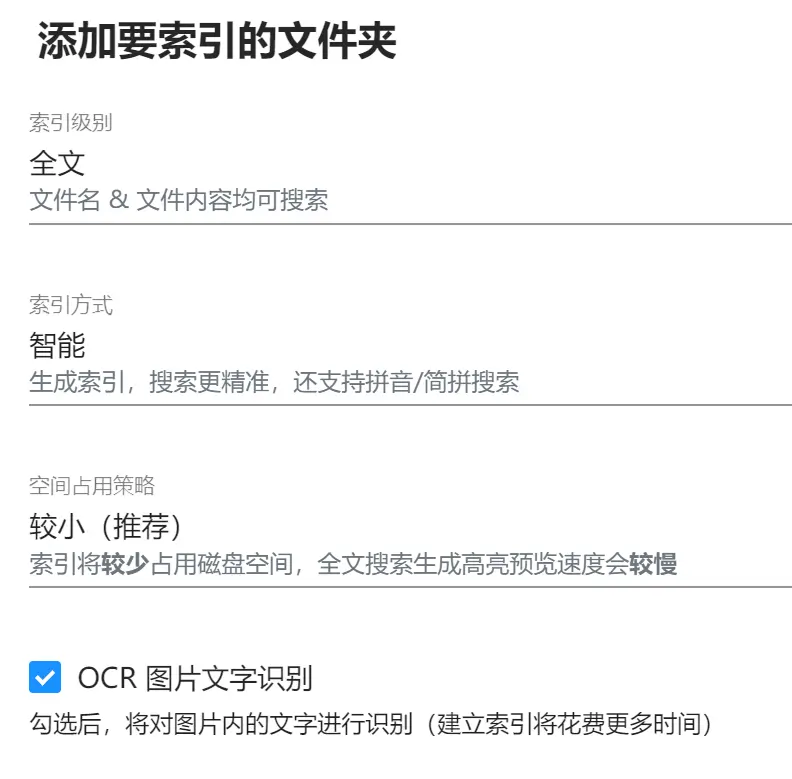 使用方式是,在添加文件夹索引时,勾选OCR 图片文字识别,等待索引完成后,进行内容搜索即可。
