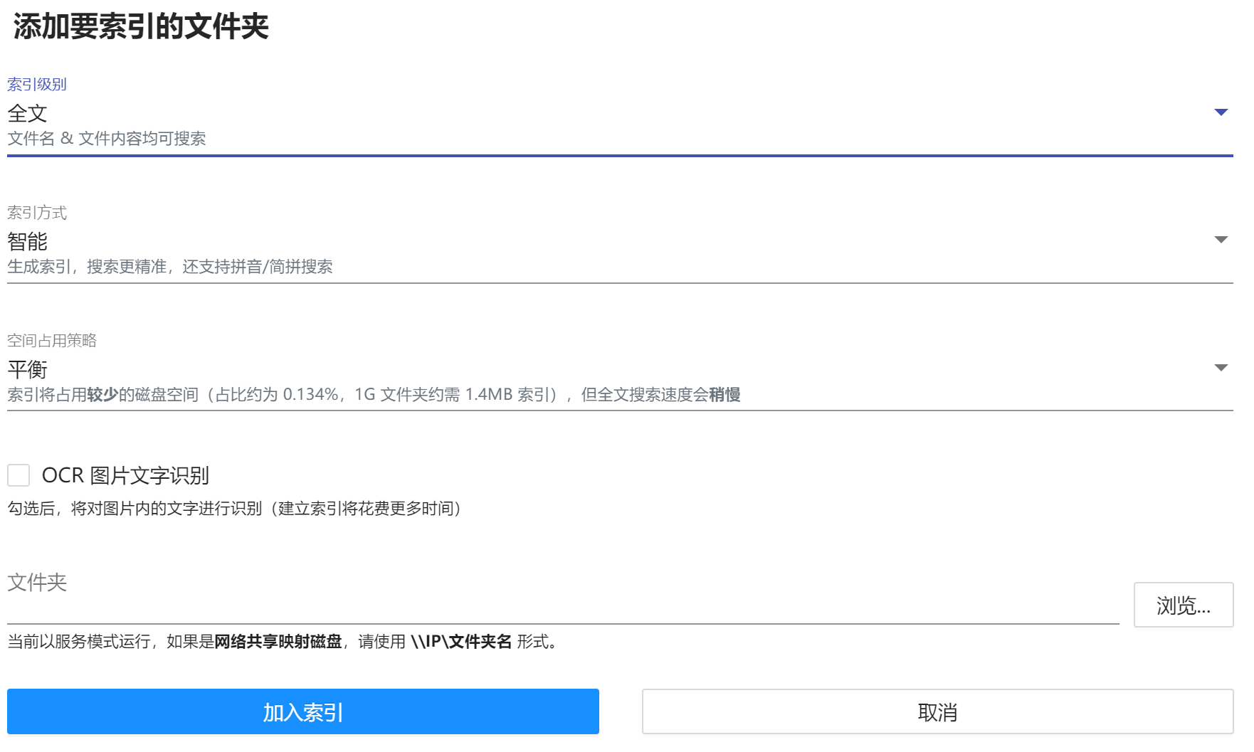 - 全文搜索是要手动将需要索引的文件夹添加的,不添加软件不会自动做全文索引的,请在 右上角“设置”->索引文件夹->添加文件夹索引 里添加(界面如下图)!