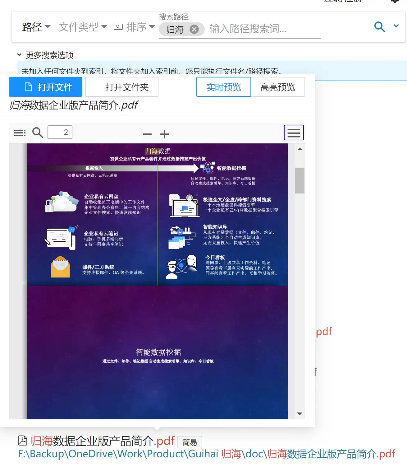 如上图,对于 PDF 支持实时预览,并且能一定程度上高亮搜索关键词。