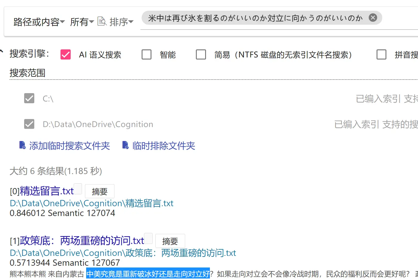 为了体现效果,将内容中的某句话“中美究竟是重新破冰好还是走向对立好”翻译为日文“米中は再び氷を割るのがいいのか対立に向かうのがいいのか”后进行搜索: