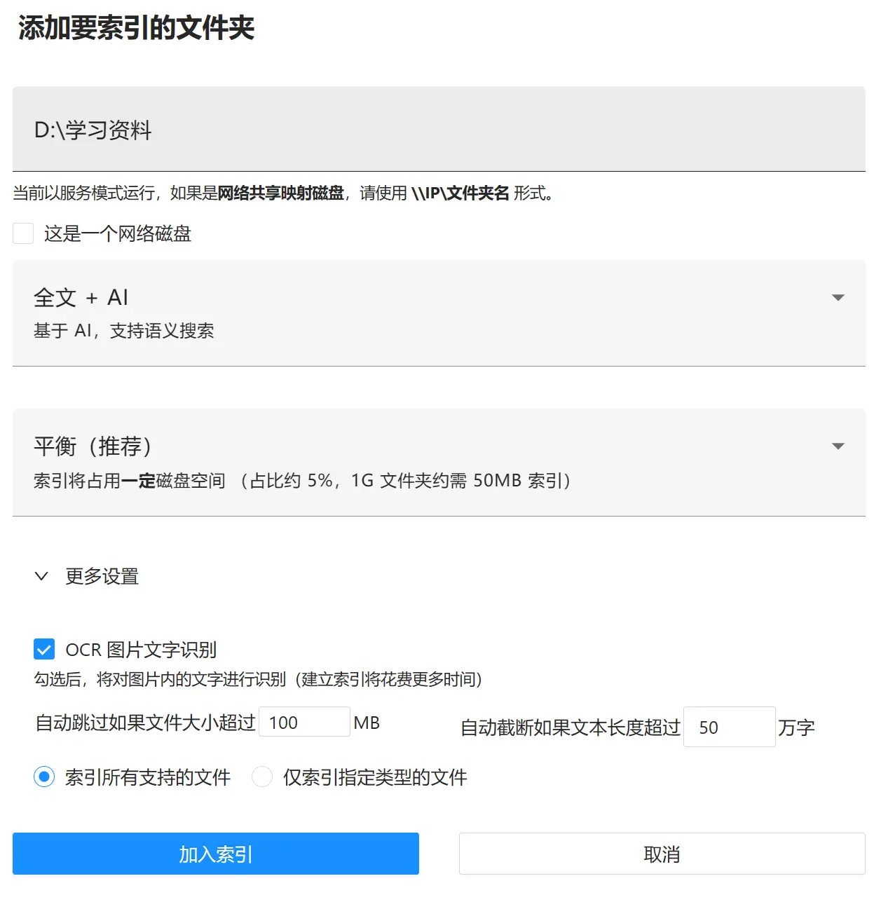 • ☑ 傻瓜化自定义索引文件夹文件类型限定(比如限定A文件夹仅索引文档类文件,B文件夹仅索引图片文件)(3.1.8 版已支持)